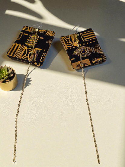 Washable, 100% African fabric print with gold chain. Brownish/ Black Earrings, SQUARE (African mix print colors as pictured)