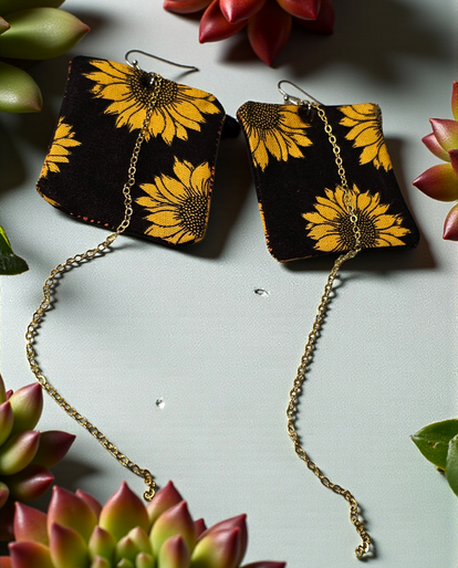 Washable, 100% African fabric print with gold chain. Yellow/ Black Earrings, SQUARE (African mix print colors as pictured)