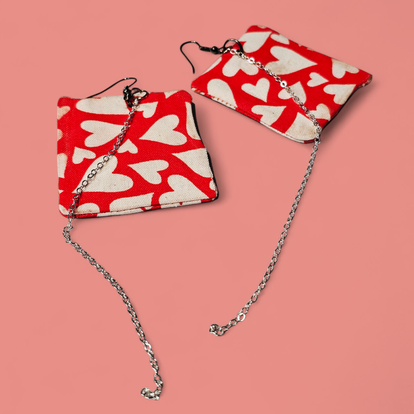 Washable, 100% African fabric print with silver chain. Red/White Earrings, SQUARE (African mix print colors as pictured)